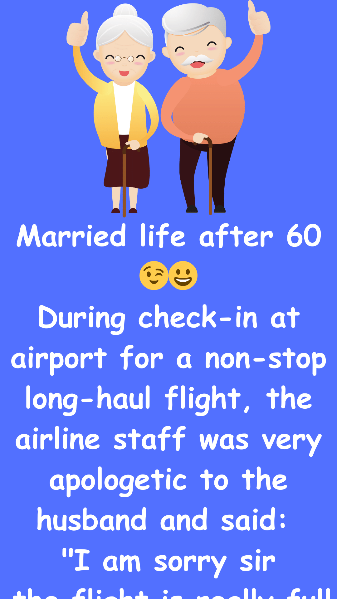 Married life after 60 ????????During check-in at airport for a non-stop long-haul flight, the airline staff was very apologetic to the husband and said:“I am...