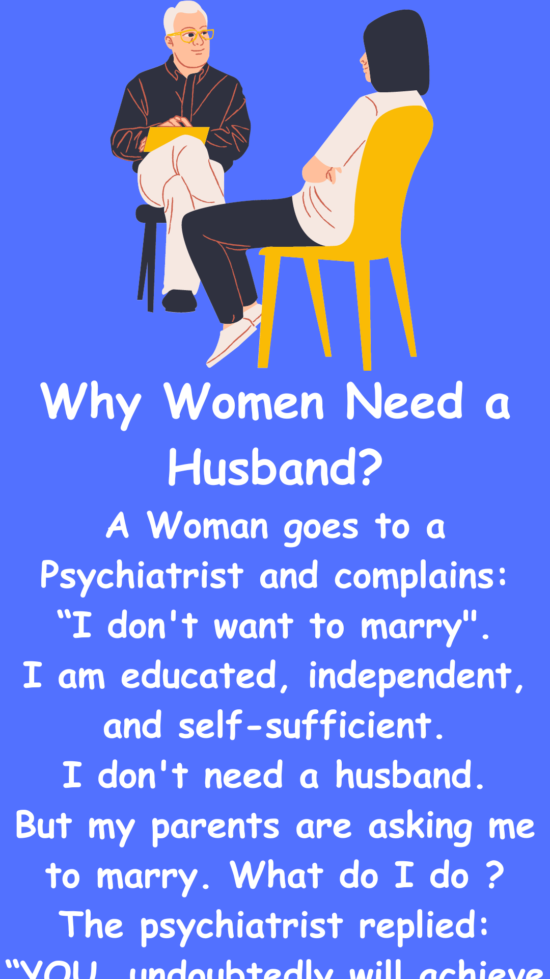 Why Women Need a Husband? A Woman goes to a Psychiatrist and complains: “I don’t want to marry”. I am educated, independent, and self-sufficient. I...