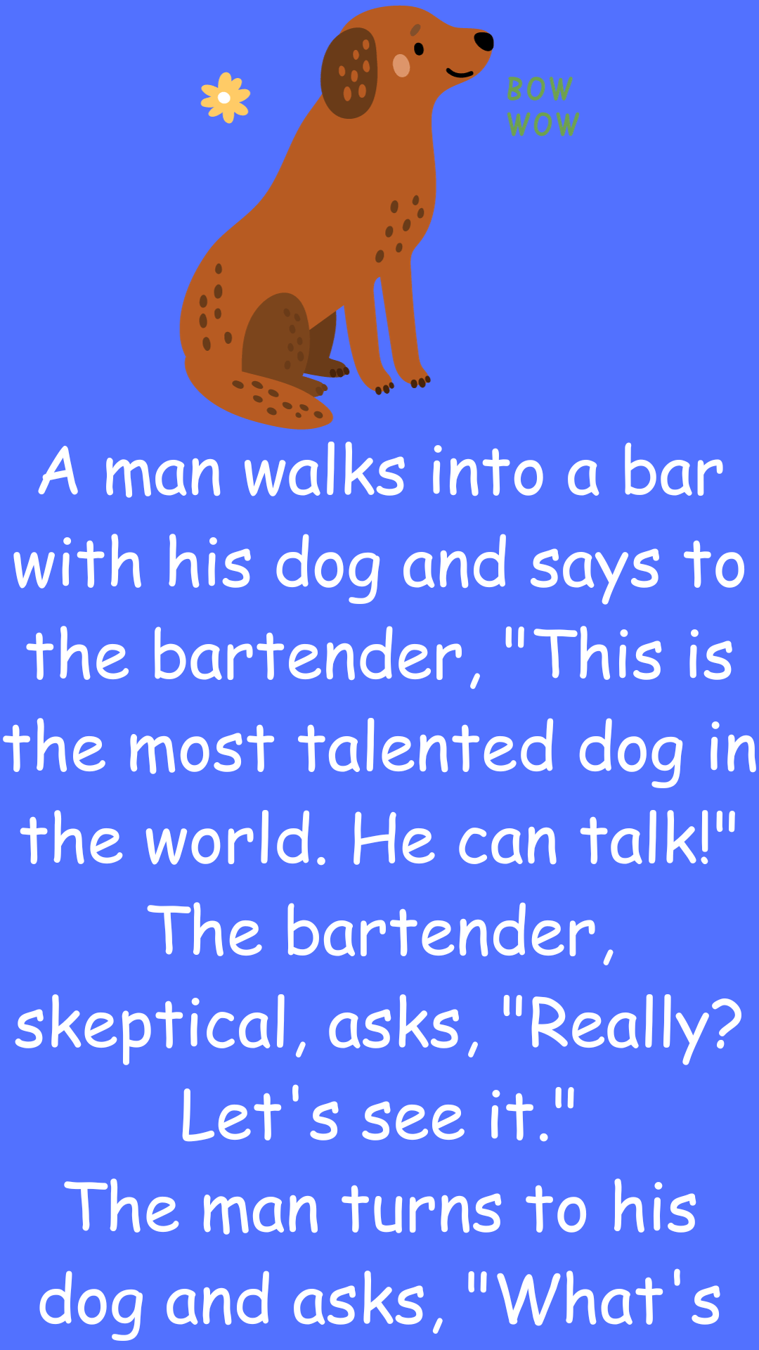 A man walks into a bar with his dog and says to the bartender, “This is the most talented dog in the world. He can...