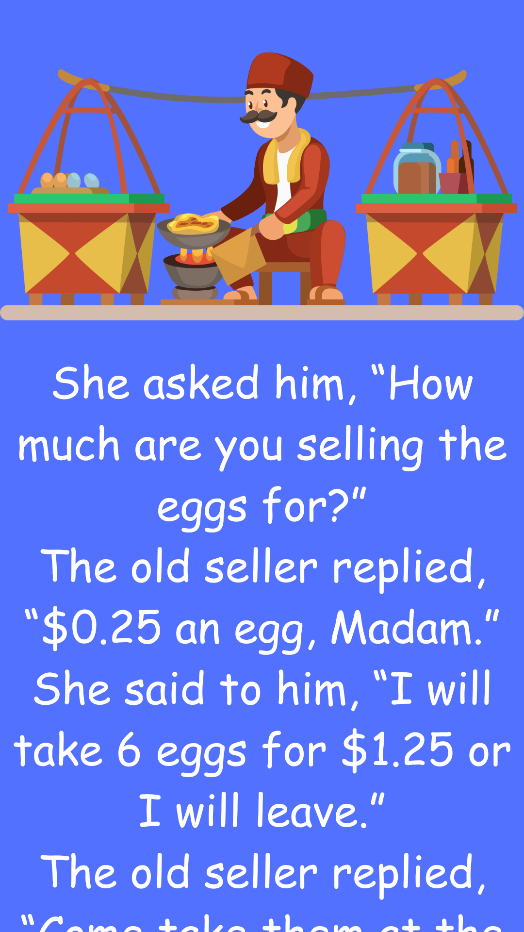 She asked him, “How much are you selling the eggs for?” The old seller replied, “$0.25 an egg, Madam.” She said to him, “I will...