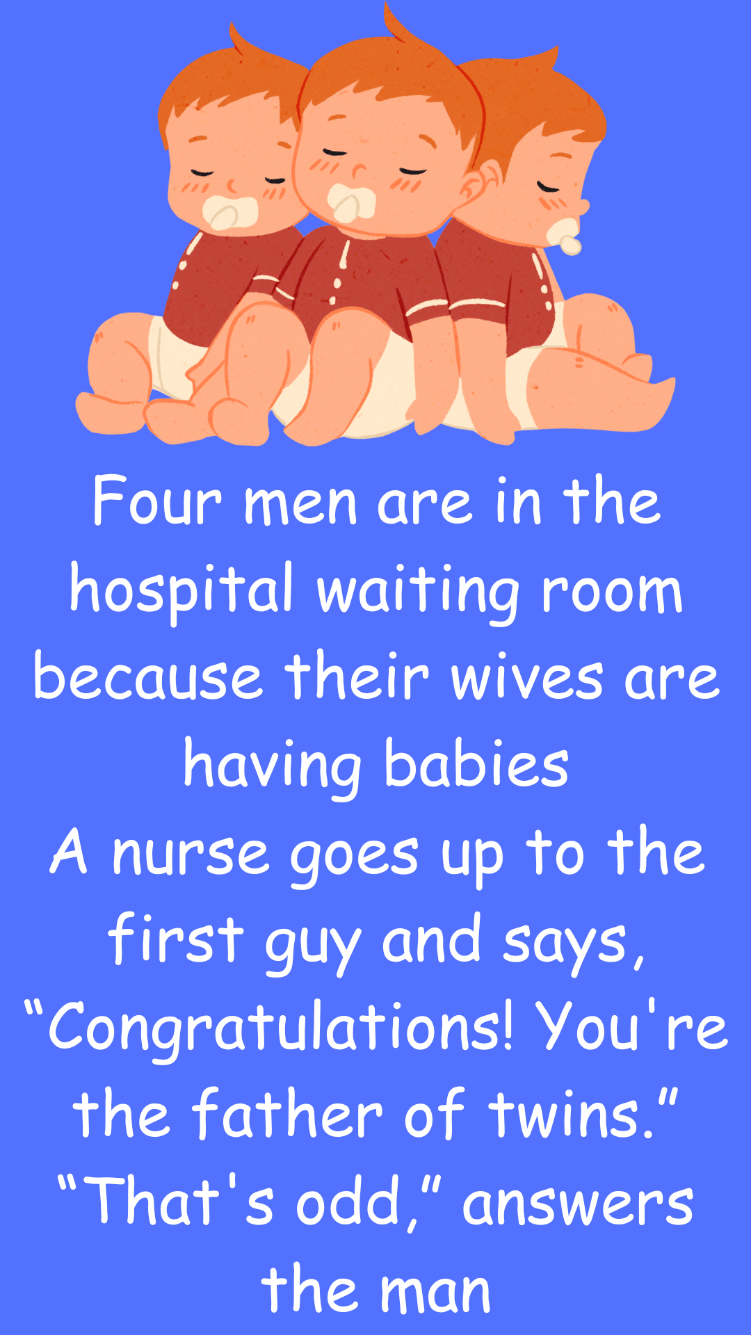 Four men are in the hospital waiting room because their wives are having babies A nurse goes up to the first guy and says, “Congratulations!...